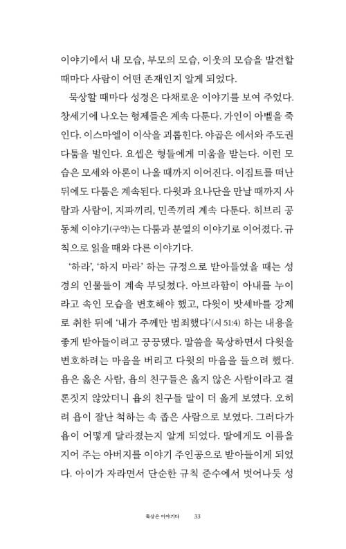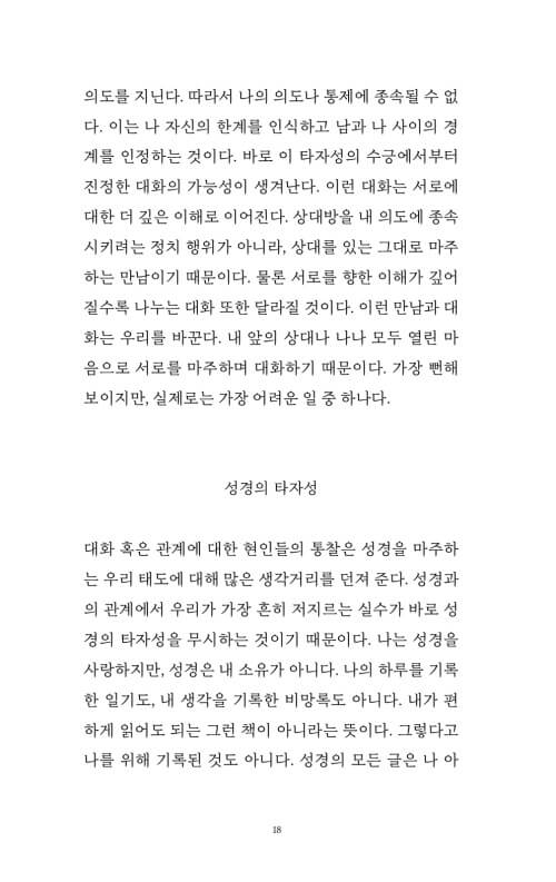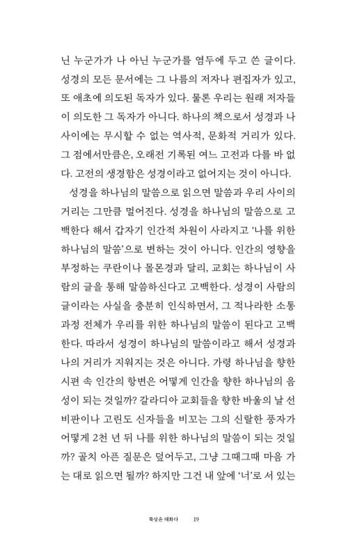 말씀에 대한 폭력이 이렇게 쉽게 자행되는 것은 하나님의 말씀이 생생한 육성으로 들리는 것이 아니라, 아무 말도 하지 않는 글로 존재하기 때문이다. 글은 스스로 자기 의미를 내세우지 않는다. 글로 된 말씀과의 대화는 전적으로 내 편에서의 해석에 달려 있다. 성경을 펴서 읽는 것도 나요, 거기 쓰인 내용을 해석하는 것도 나다. 그래서 내가 원하는 방식으로 주무를 수 있다. 읽는 과정에서 이런저런 조작을 수행할 수 있고, 읽은 결과를 내가 원하는 방식으로 활용할 수도 있다. 내가 하고 싶은 생각을, 내가 하고 싶은 일을 하나님의 이름으로 할 수 있으니 이보다 좋을 수가 없다. 하지만 말리는 사람이 없다. 독이 오른 사춘기 아이와 달리, 말씀은 사랑을 가장한 나의 집착과 폭력에 저항하지 않는다. 그래서 나는 나의 폭력을 인식하지 못한다. 내가 우겨서 메시지를 찾아내거나 본문을 취사선택하여 메시지를 만들어도 잘못했다는 생각이 들지 않는다. 오히려 하나님이 내게 맞는 말씀을 주셨다고 감사하고, 나와 하나님의 관계가 건강하다고 기뻐한다. 문제가 없어 보이지만, 실은 위험한 상태다.