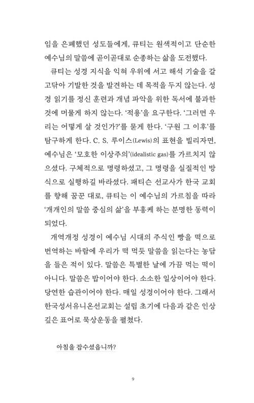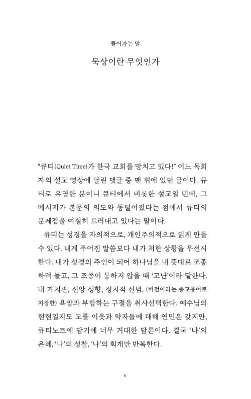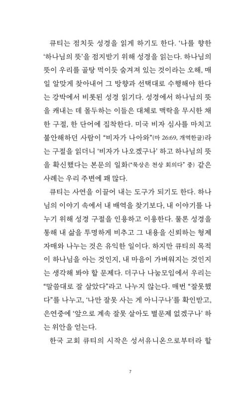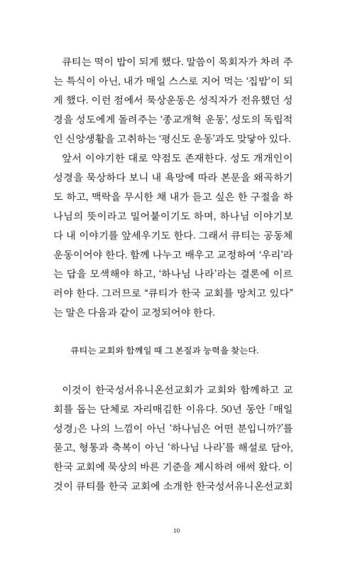 신앙의 열정은 가득했으나 말씀을 중심으로 하는 삶은 살아 내지 못했던 한국 교회 성도들에게, 큐티(Quiet Time)는 스스로 말씀을 읽고 깨닫고 살도록 이끄는 중요한 역할을 했다. 하지만 자의적이고 개인주의적인 해석, 하나님의 뜻을 점지받는 데 목적을 두는 성경 읽기, 하나님 말씀은 사라지고 사람의 사연만 남는 큐티 나눔은 비판의 대상이 되기도 했다.