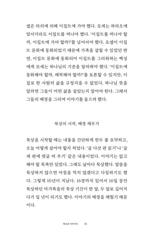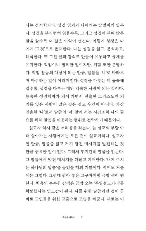 묵상은 하나님의 말씀을 통해 나의 진면목을 보는 것이다. 묵상을 통해 하나님의 천상 회의에 들어서면, 하나님 앞에서 나의 잘난 것은 고스란히 사라지고 누추하고 부끄럽고 수치스러운 것만 드러난다. 성경 묵상을 통해 내가 거룩해지는 것이 아니라 도리어 내가 더러운 존재라는 것만 발견된다. 그래서 성경을 연구하는 것은 고통이고 아픔이며 두려움이다. 초보자였을 때는 성경을 읽으면서 기대감과 설렘으로 가득했고 하나님을 알아 가는 기쁨이 가득했다. 그러나 시간이 갈수록 정반대 현상이 나타난다. 지금은 성경을 묵상하면 따갑고 아프고 고통스럽다.
