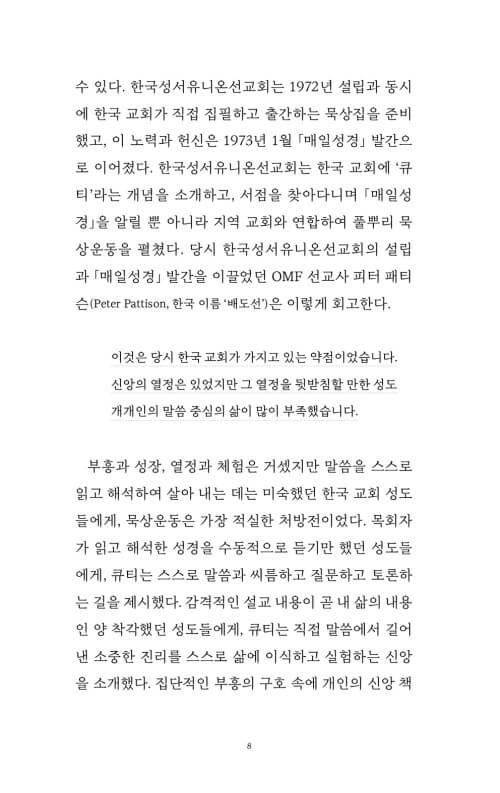 이러한 큐티의 명과 암을 솔직히 돌아보고 묵상에 대한 다양한 논의의 장을 여는 것이 큐티를 한국 교회에 소개한 한국성서유니온선교회의 역할일 것이다. 지난 50년 동안 「매일성경」은 ‘내 느낌’이 아닌 ‘하나님은 어떤 분입니까?’를 묻고, 형통과 축복이 아닌 ‘하나님 나라’를 해설로 담아, 한국 교회에 묵상의 바른 기준을 제시하려 애썼다. 다음 50년을 향해 힘찬 발걸음을 내디디는 이 순간, 이 책을 통해 모인 생각들을 한국 교회와 나누고 함께 고민하며, 변화하는 시대를 품되 변함없는 말씀의 능력을 증언하는 매일의 묵상 동반자가 되기를 소망한다.