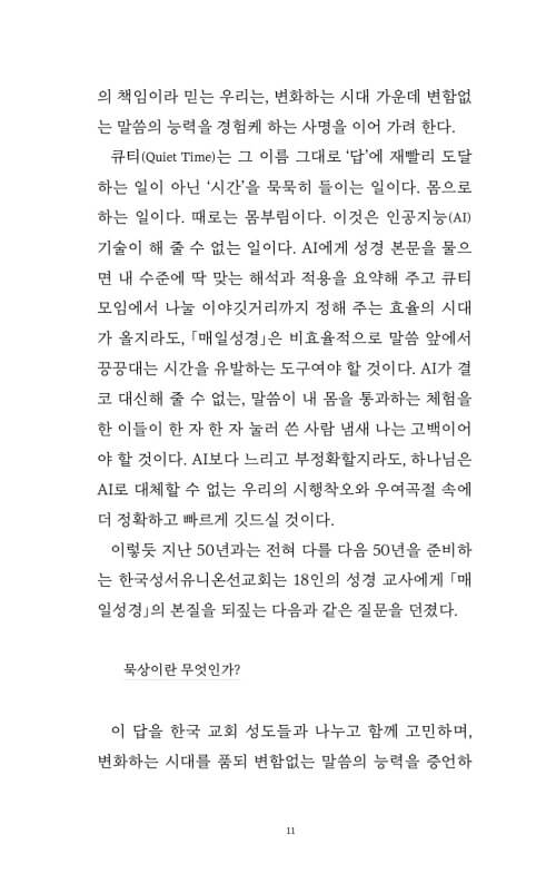 큐티(Quiet Time)는 그 이름 그대로 ‘답’에 재빨리 도달하는 일이 아닌 ‘시간’을 묵묵히 들이는 일이다. 몸으로 하는 일이다. 때로는 몸부림이다. 이것은 인공지능(AI) 기술이 해 줄 수 없는 일이다. AI에게 성경 본문을 물으면 내 수준에 딱 맞는 해석과 적용을 요약해 주고 큐티모임에서 나눌 이야깃거리까지 정해 주는 효율의 시대가 올지라도, 「매일성경」은 비효율적으로 말씀 앞에서 끙끙대는 시간을 유발하는 도구여야 할 것이다. AI가 결코 대신해 줄 수 없는, 말씀이 내 몸을 통과하는 체험을 한 이들이 한 자 한 자 눌러 쓴 사람 냄새 나는 고백이어야 할 것이다. AI보다 느리고 부정확할지라도, 하나님은 AI로 대체할 수 없는 우리의 시행착오와 우여곡절 속에 더 정확하고 빠르게 깃드실 것이다.