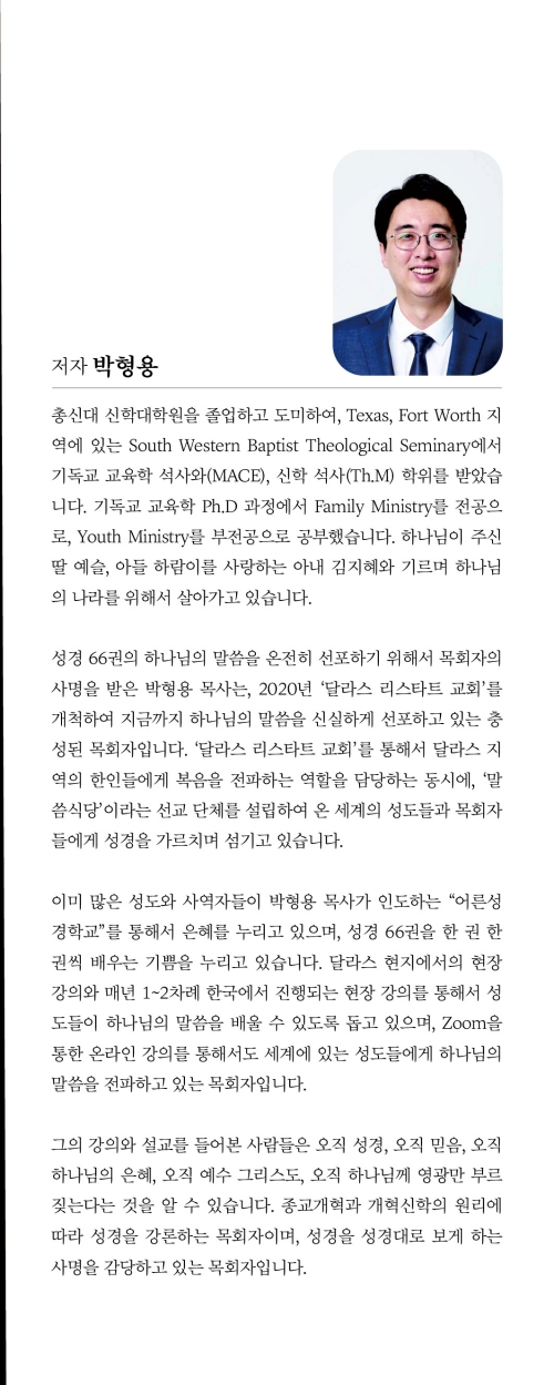 박형용 목사님은 늘 말씀을 깊이 붙들고 묵상하며, 성도들의 삶 속에 그 말씀을 풀어내는 일에 헌신해 오셨습니다. 그렇게 목회 현장에서 성도들의 삶에 녹아든 살아 있는 말씀이기에, 이 책은 목자의 심정으로 풀어낸 복음의 향기입니다. 책장을 넘기다 보면, 예수님이 우리 삶의 가장 깊은 자리에서 “나는 너의 빛이다, 나는 너의 길이다, 나는 너의 목자다”라고 속삭이시는 은혜를 경험하게 될 것입니다. 그 은혜가 독자들의 지친 마음을 위로하고, 흔들리는 발걸음을 붙들며, 다시금 주님을 따르는 기쁨으로 채워줄 것을 믿습니다. 저는 이 책을 통해 많은 성도들이 예수님을 더 깊이 알고, 삶의 자리에서 그분을 따르는 제자가 되기를 간절히 소망하며, 기쁜 마음으로 이 책을 추천합니다.