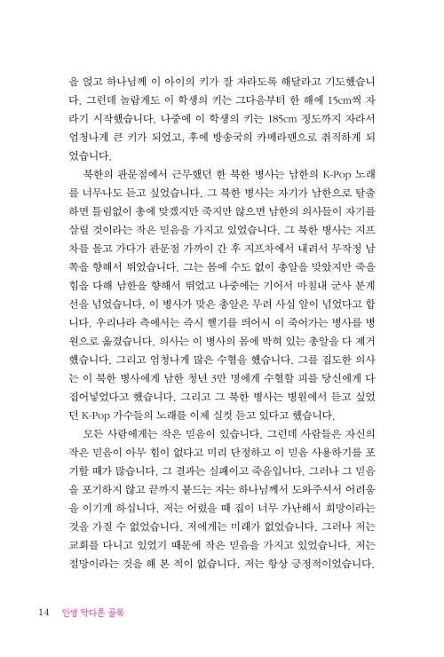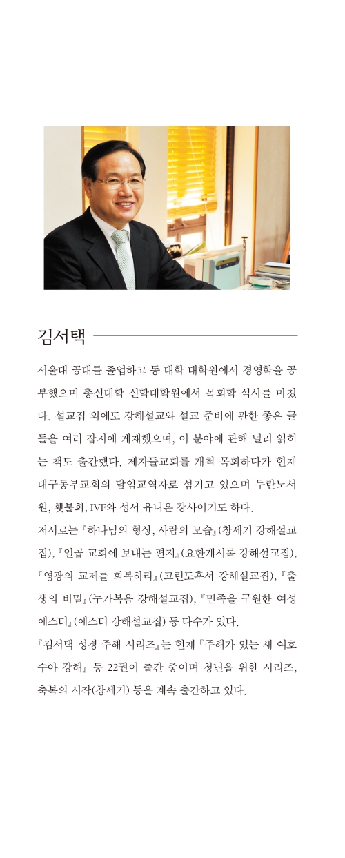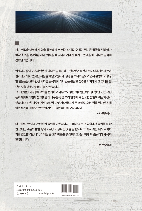 저는 어렸을 때부터 제 삶을 돌아볼 때 이 이상 나아갈 수 없는 막다른 골목을 만날 때가 많았던 것을 생각했습니다. 어렸을 때 사나운 개에게 쫓기고 있었을 때, 막다른 골목에 갇혔던 것입니다. 이제까지 살아오면서 인생의 막다른 골목이라고 생각했던 순간에 하나님에게는 새로운 길이 준비되어 있다는 사실을 깨달았습니다. 성경을 보니까 살아가면서 유명하고 성공한 인물들은 모두 인생 막다른 골목에서 하나님을 붙잡고 성경을 의지해서 그 고비를 넘겼던 것을 너무나도 많이 볼 수 있습니다. 크고 안정된 대구동부교회를 은퇴하고 아무것도 없는 허허벌판에서 몇 명 안 되는 교인들과 예배드리면서 설교했던 이 내용은 정말 우리 인생에 꼭 필요한 말씀이 아닌가 생각했습니다. 마치 예수님께서 보리떡 다섯 개와 물고기 두 마리로 오천 명을 먹이신 후에 남은 부스러기를 모으셨듯이 저도 그 부스러기를 모았습니다.
