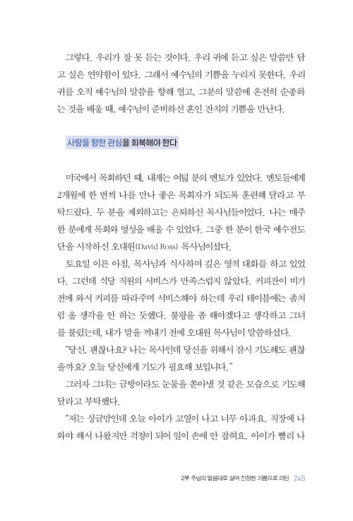 사람들의 환호와 박수를 뒤로하고 하나님과 함께하는 고요함으로의 돌이킴이 예수님의 기도다. p.27