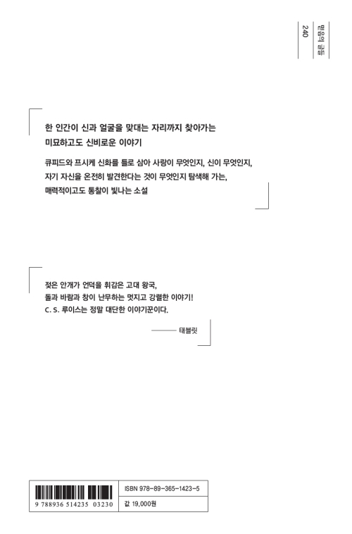 “우리가 아직 얼굴을 찾지 못했는데 어떻게 신과 얼굴을 맞댈 수 있겠는가?” 이 말은 소설의 주인공이자 프시케의 언니인 오루알의 인생 최후의 독백이다. ‘큐피드와 프시케 이야기’를 변형시킨 루이스는 화자이자 또 한 명의 주인공으로 프시케의 언니 오루알을 등장시킨다. 신이 자신의 사랑을 앗아가 버렸다며 신에게 고소장을 내미는 오루알. 그러나 종국에 그녀는 평생 베일 뒤에 감춰 두었던 자신의 얼굴을 드러내는데······.