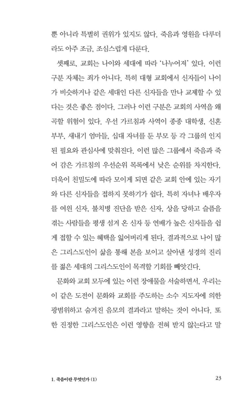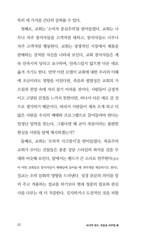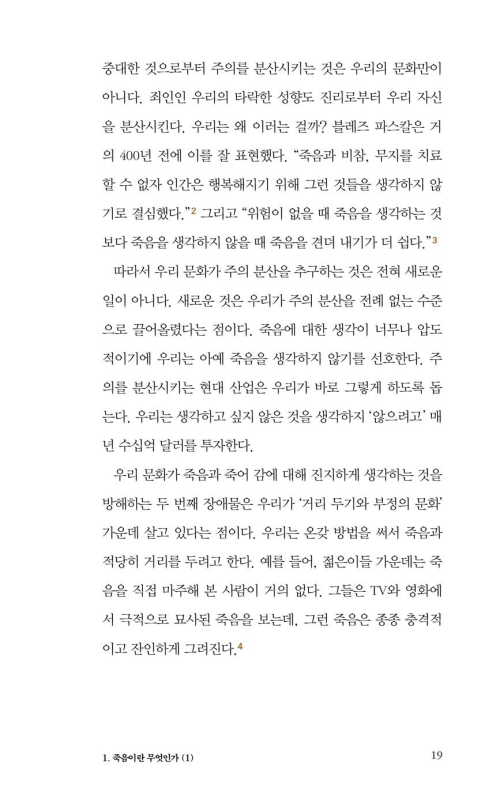 물론 중대한 것으로부터 주의를 분산시키는 것은 우리의 문화만이 아니다. 죄인인 우리의 타락한 성향도 진리로부터 우리 자신을 분산시킨다. … 따라서 우리 문화가 주의 분산을 추구하는 것은 전혀 새로운 일이 아니다. 새로운 것은 우리가 주의 분산을 전례 없는 수준으로 끌어올렸다는 점이다. 죽음에 대한 생각이 너무나 압도적이기에 우리는 아예 죽음을 생각하지 않기를 선호한다. 주의를 분산시키는 현대 산업은 우리가 바로 그렇게 하도록 돕는다. 우리는 생각하고 싶지 않은 것을 생각하지 ‘않으려고’ 매년 수십억 달러를 투자한다.