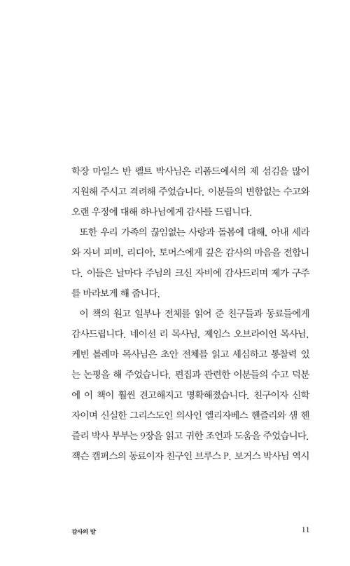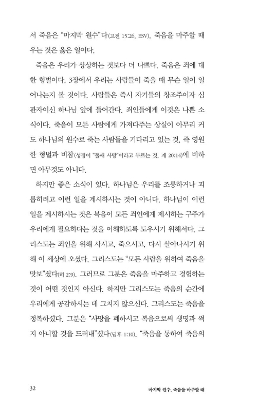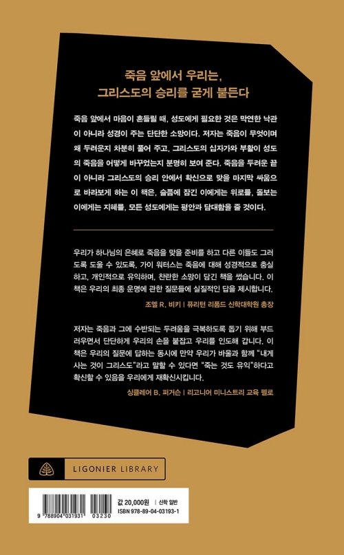 사람에게 정해진 연수인 칠십 세에 이른 나는 죽음의 현실을 마주해야 한다는 것을 깨닫고 있습니다. 그러나 이 책은 내가 죽음을 섬뜩함과 두려움 가운데 대하는 것이 아니라 생명을 주는 하나님의 말씀이 제공하는 확신 가운데 대하도록 도와주었습니다. 성경이 죽음에 대해 가르치는 모든 세세한 의미를 철저히 다루면서, 가이 워터스는 목회자들뿐 아니라 슬퍼하는 이들, 그리고 죽음을 맞이할 우리 모두에게 매우 귀중한 책을 썼습니다. 『마지막 원수, 죽음을 마주할 때』는 우리의 죽음과 그리스도의 죽음, 그리고 그리스도의 부활과 우리의 부활 사이의 연관성을 일관되게 보여 줍니다.