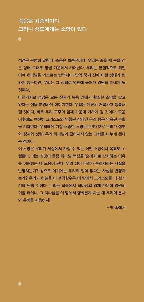 이 책은 교리를 정리하는 데서 그치지 않고 더 나아간다. 저자는 죽음을 앞둔 이에게 필요한 준비, 남은 가족과 함께하는 공동체의 동역, 연명 치료를 둘러싼 윤리적 고민 등, 죽음과 관련한 실제적인 일들 가운데 ‘믿음을 살아내는 법’을 안내한다. 이 과정에서 위로는 감정 어린 문장이 아니라 진리의 언어가 되고, 슬픔은 억누를 감정이 아니라 소망 안에서 감당할 믿음의 자리가 된다. 이 책을 통해 독자는, 죽음 너머 소망을 붙잡는 일은 오늘의 삶을 약화하는 대신, 사랑과 책임과 거룩한 삶의 동기를 강화하여 다가올 영원한 안식을 준비하게 함을 깨닫게 될 것이다.