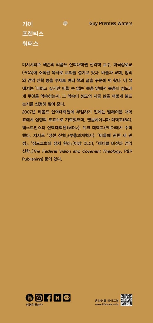 죽음은 흔히 두렵게 느껴지고, 죽음에 대해 말하는 것은 거북하게 여겨집니다. 하지만 죽음은 실재하며, 주님이 다시 오실 때까지 우리 자신과 다른 이들이 반드시 마주해야 하는 불가피한 현실입니다. 그러나 그리스도를 믿는 신자들은 죽음을 이겼으며, 따라서 죽음을 두려워할 필요가 없습니다. 우리가 하나님의 은혜로 죽음을 맞을 준비를 하고 다른 이들도 그러도록 도울 수 있도록, 가이 워터스는 죽음에 대해 성경적으로 충실하고, 개인적으로 유익하며, 찬란한 소망이 담긴 책을 썼습니다. 당신이 목회자이든, 상담자이든, 다른 이를 돌보는 친구이든, 아니면 단순히 주님 안에서 확신에 찬 소망을 품고 죽음을 맞을 준비를 하고 싶은 사람이든, 이 책은 우리의 최종 운명에 관한 질문들에 실질적인 답을 제시합니다.