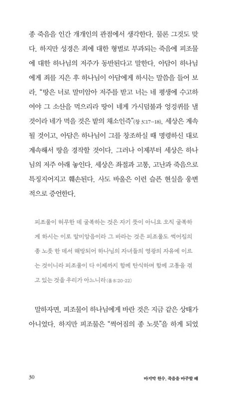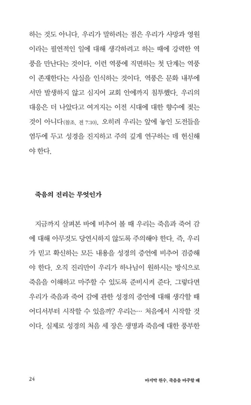 한국 사회와 교회 안에서 ‘죽음’은 여전히 자연스럽게 말하기 어려운 주제다. 그 결과 많은 신자가 죽음을 신앙의 눈으로 바라보고 준비하는 길을 충분히 안내받지 못하고, 불확실한 정보와 비성경적 관점(죽음 이후의 또 다른 기회, 사후의 정화 과정 등) 사이에서 혼란을 겪는다. 『마지막 원수, 죽음을 마주할 때』의 저자 가이 프렌티스 워터스는 죽음을 “마지막 원수”로 규정하고, 그리스도의 대속적 죽음과 부활로 죽음의 저주가 깨졌다는 복음의 중심 진리를 선언해, 성도가 담대하고 지혜롭게 삶의 마지막을 대하도록 돕는다.