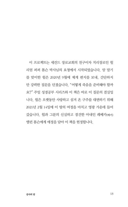 우리 사회는 죽음이라는 현실을 직시하기를 회피하는 경향이 있으며, 그 결과 우리 자신이나 사랑하는 사람에게 죽음이 닥쳤을 때 준비되어 있지 않은 경우가 종종 있습니다. 심지어 그리스도인조차도 죽음과 그 이후에 일어나는 일에 대한 관점이 흐릿할 수 있습니다. 하지만 성경은 우리가 죽음을 마주하는 때에 ‘매우 많은’ 도움과 소망을 제공합니다. 하나님이 누구이시고, 하나님의 전반적인 계획이 무엇이며, 예수님의 부활이 그분의 백성에게 죽음을 어떻게 변화시키는가 하는 사실은, 비통과 상실의 한가운데서도 모든 것을 변화시키는 구체적인 소망으로 우리 삶에 와닿습니다. 워터스는 죽음과 죽어 감, 슬픔에 대한 성경의 진리를 철저하게 설명할 뿐 아니라 목회적이면서도 실용적인 통찰과 조언을 제공하는 큰 공헌을 했습니다. 이 책은 당신에게 매우 유용한 자료가 될 것입니다.