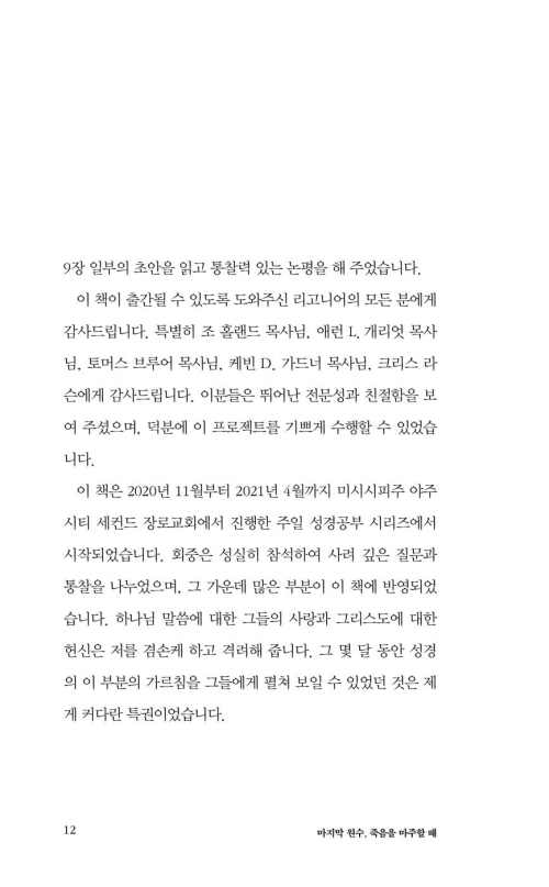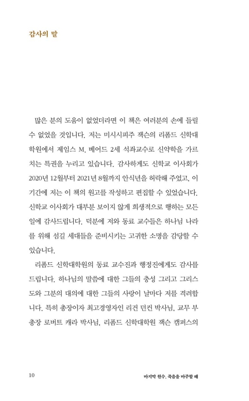 간단히 말해, 워터스 박사는 우리 모두가 마주하는 문제인 죽음과 그 이후의 일에 대해 신학적으로 건전하고 실용적인 책을 제공해 주었습니다. 신약학자의 시각으로 쓰였지만 모든 사람이 이해할 수 있는 책인 『마지막 원수, 죽음을 마주할 때』는 죽음을 맞이하는 이들과 그 가족에게 귀중한 도움을 줄 것입니다. 내가 알기로 이 중요한 필요를 이 책만큼 잘 충족한 책은 없습니다. 내가 섬기는 교회에서 이 책을 강력히 추천할 것입니다. 정말 귀중한 책입니다.