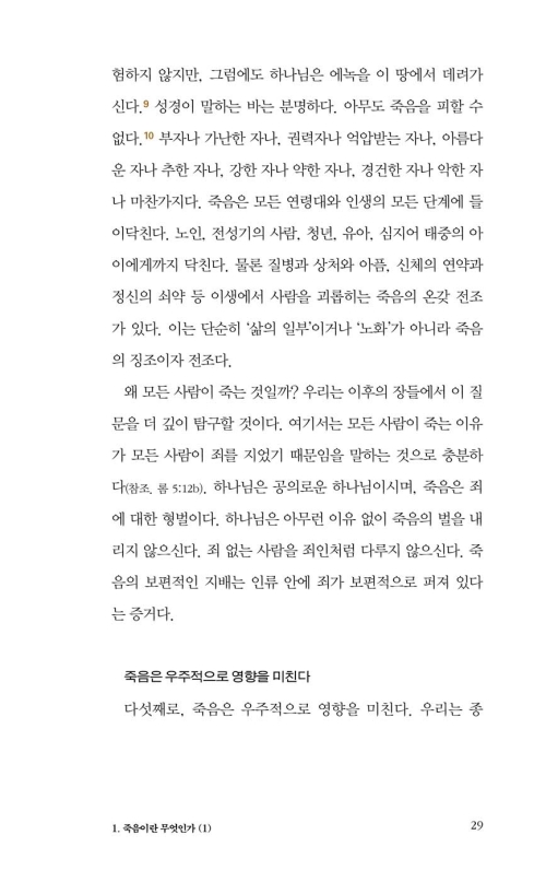 저자는 죽음이 인간의 타락에서 비롯된 비정상적 현실임을 분명히 하고, 그리스도의 부활이 신자에게 영원한 생명과 승리를 보장한다는 복음의 결론으로 독자를 이끈다. 독자는 ‘죽음이 두렵지 않다’는 감정적 자기암시가 아니라, 죽음을 어떻게 이해하고 어떤 태도로 준비할지 성경적 좌표를 얻는다. 죽음 이후에 대한 흐릿한 상상과 단편적인 정보가, 그리스도 안에서 소망(중간 상태, 마지막 심판, 몸의 부활, 천국과 지옥)으로 정돈된다. 그 결과 독자는 막연한 기대가 아니라 교리적 확신 위에서 평안을 누린다.