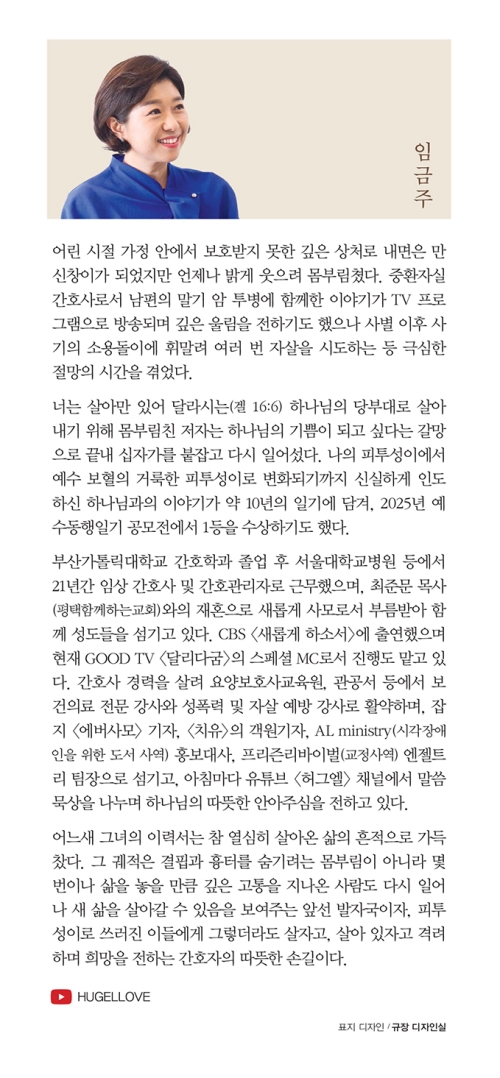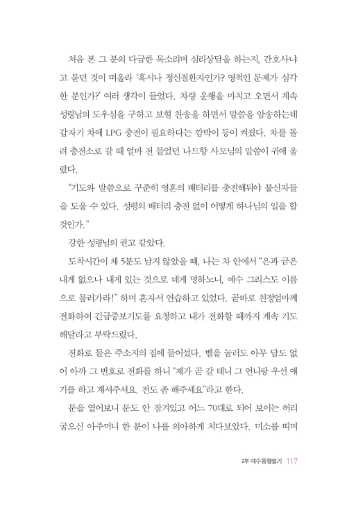 임금주 사모님의 인생은 한 편의 드라마보다 더 극적입니다. 그녀의 ‘살아 있음’ 자체가 기적임을 증명합니다. 그런 시간 속에서도 사모님은 예수동행일기를 써 내려갔습니다. 고난이 미화되지 않았고, 믿음이 포장되지 않았습니다. 대신, 넘어지고 다시 일어나는 과정이 사실 그대로 기록되어 있습니다. 잘 정리된 신앙 고백이라기보다, 하루를 버티며 주님께 드렸던 솔직한 마음의 기록에 가깝습니다. 그래서 비슷한 질문을 품고 있는 독자들에게 이 책은 이렇게 말해 줍니다.