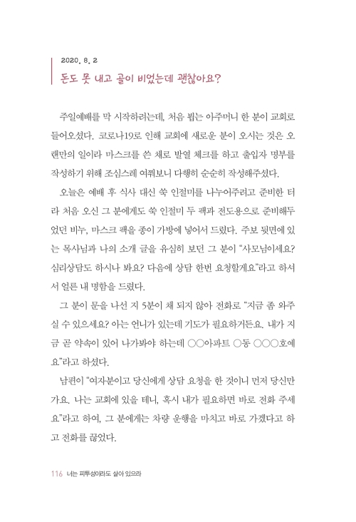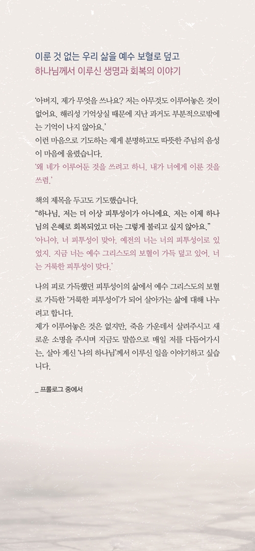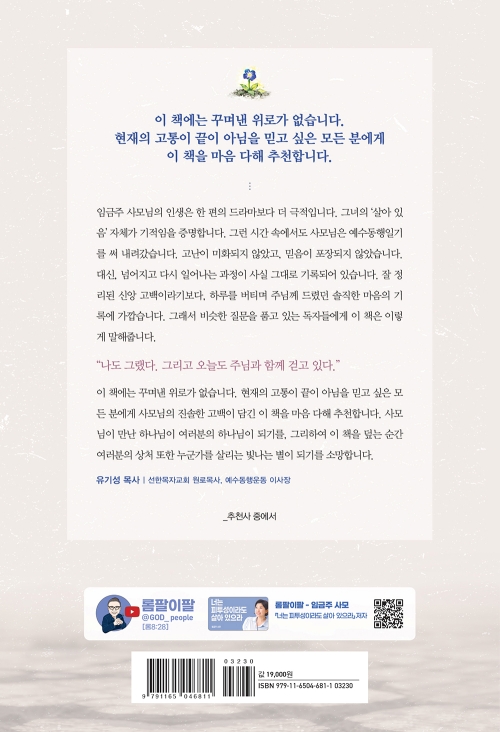 이 책에는 꾸며낸 위로가 없습니다. 현재의 고통이 끝이 아님을 믿고 싶은 모든 분에게 사모님의 진솔한 고백이 담긴 이 책을 마음 다해 추천합니다. 사모님이 만난 하나님이 여러분의 하나님이 되기를, 그리하여 이 책을 덮는 순간 여러분의 상처 또한 누군가를 살리는 빛나는 별이 되기를 소망합니다.