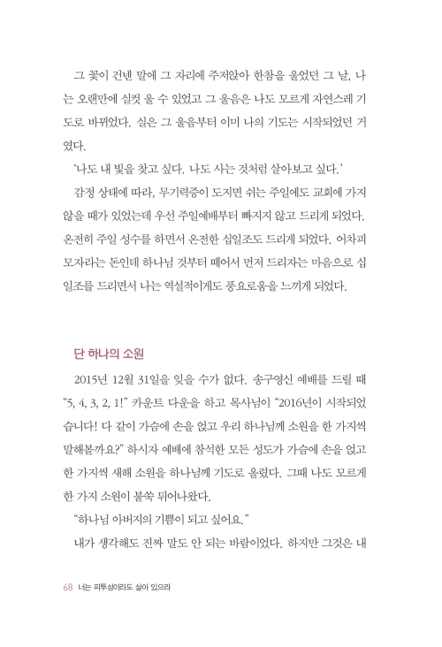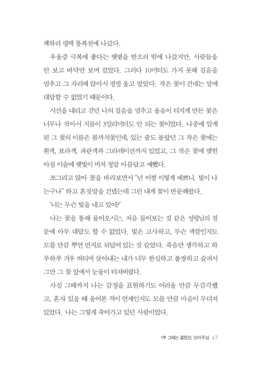 그 꽃이 건넨 말에 그 자리에 주저앉아 한참을 울었던 그 날, 나는 오랜만에 실컷 울 수 있었고 그 울음은 나도 모르게 자연스레 기도로 바뀌었다. 실은 그 울음부터 이미 나의 기도는 시작되었던 거였다. ‘나도 내 빛을 찾고 싶다. 나도 사는 것처럼 살아보고 싶다.’
