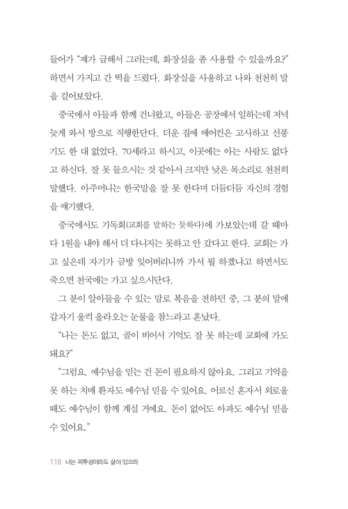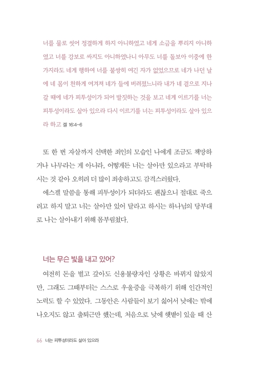 삶의 무게에 눌려 주저앉고 싶을 때가 있다. 하루하루를 견뎌내는 일조차 버겁게 느껴지는 순간도 있다. 저자 역시 그러한 시간을 지나며 견디고 살아냈다. 가정 안에서 보호받지 못한 어린 날의 상처와 남편의 말기 암 투병, 사별 후 사기에 휘말리는 등 극한의 고난을 겪었던 저자는 에스겔 말씀을 통해 “너는 살아만 있어 달라”라고 하시는 하나님의 당부대로 살아내기 위해 필사적으로 몸부림쳤다.