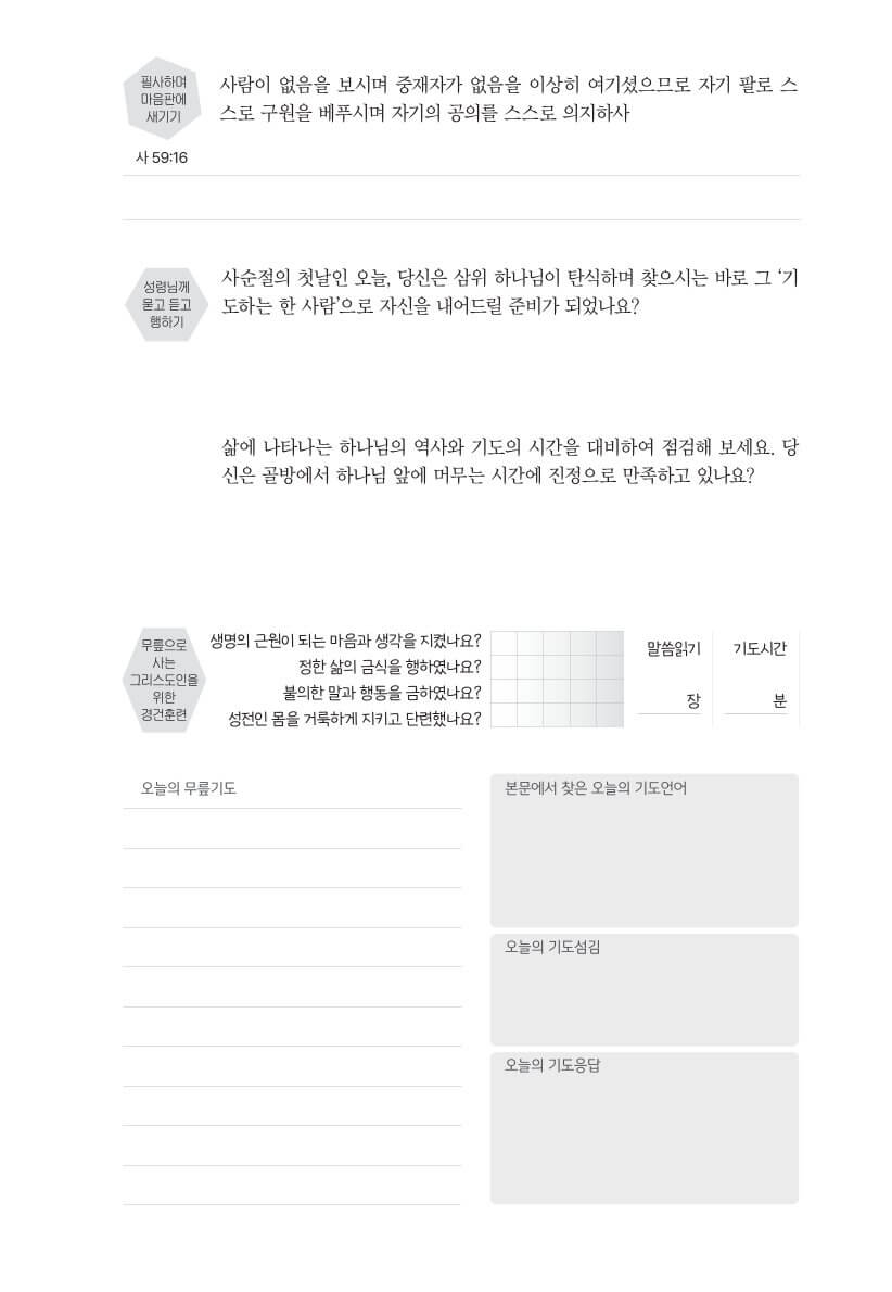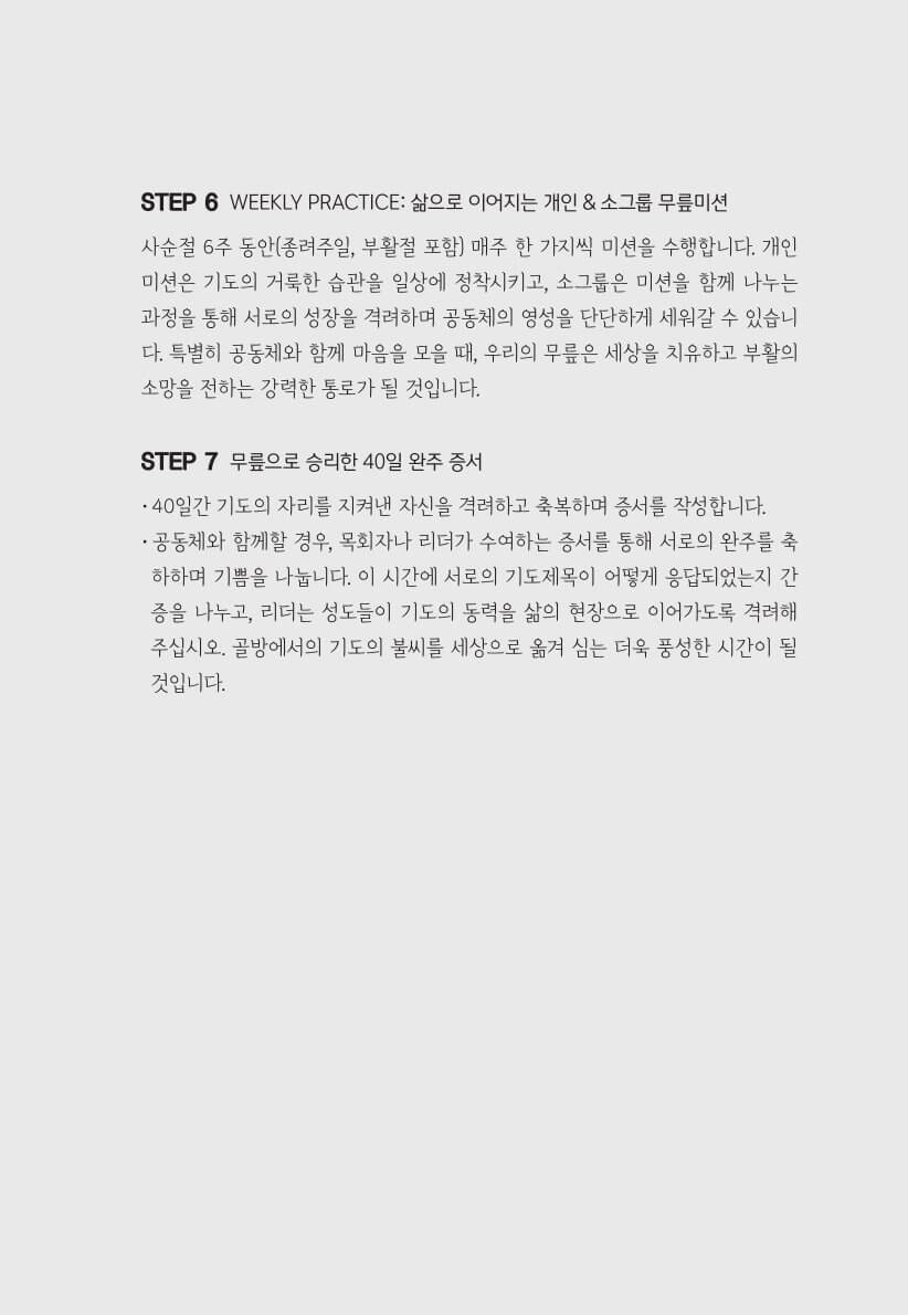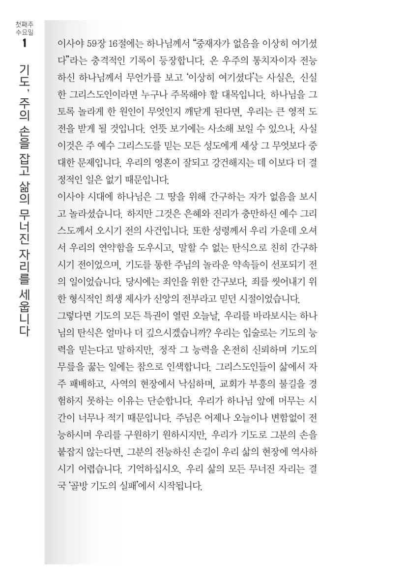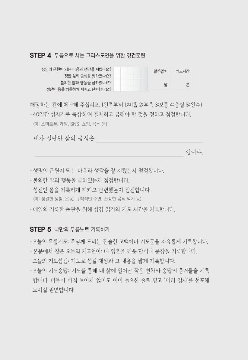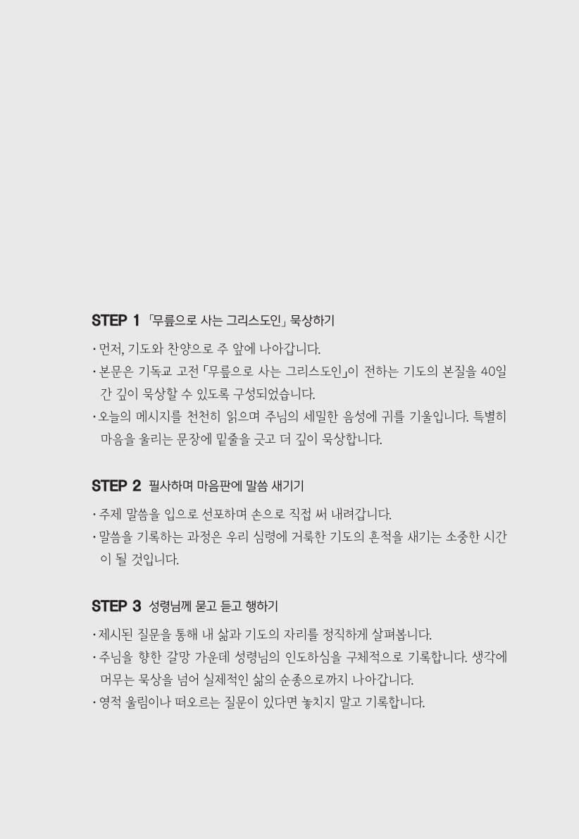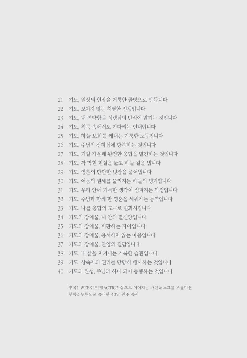 40일의 여정 동안 독자는 스스로 약속한 기도의 시간을 지켜내는 것을 넘어,