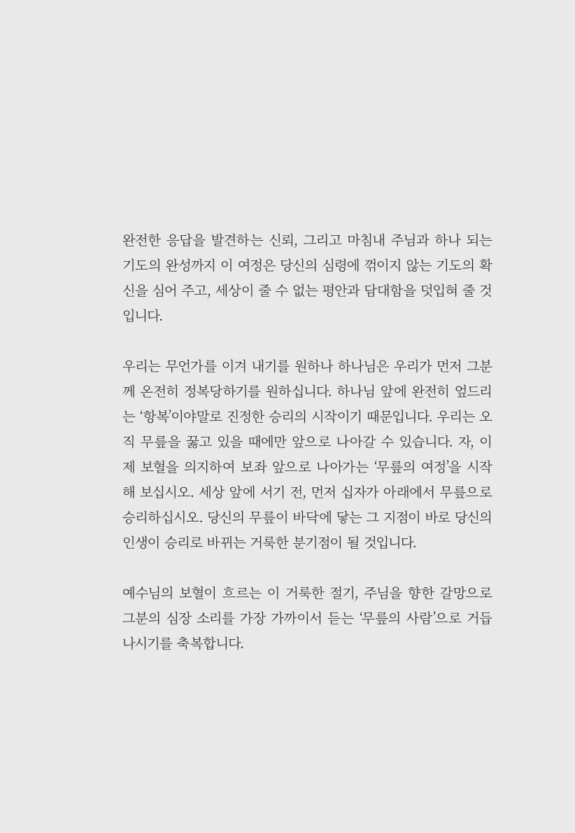 기도의 본질을 세상에 알리기 위해 써 내려간 ‘무릎의 기록’입니다.