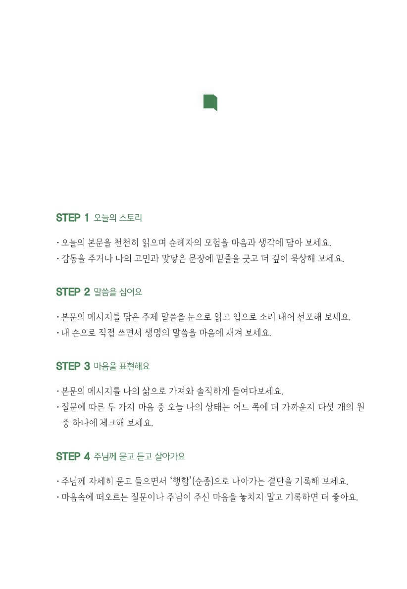 이어지는 묵상질문으로 주님의 마음을 알고 기쁘게 순종하는 법을 배우는 ‘주님께 묻고 듣고 살아가요(Step 4)’와