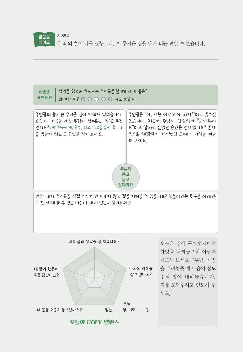 나의 솔직한 감정을 담아내는 ‘마음을 표현해요(Step 3)’를 통해 주님 앞에 진실하게 나아갑니다.