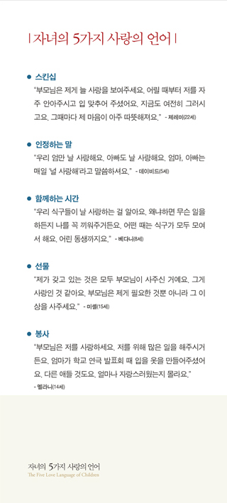 전 세계적으로 베스트셀러의 자리를 지키며 많은 사람들의 사랑과 그에 대한 표현 방식을 변화시킨 <5가지 사랑의 언어>의 자녀 편이다.