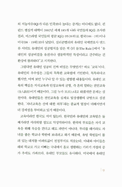 이런 점에서 한국인과 세계 1, 2위를 다투는 높은 교육열을 보이면서도 성취도에서 현격한 차이를 내는 유대 부모들의 교육법은 좋은 비교가 된다. 아인슈타인, 프로이트, 마르크스, 피카소, 로스차일드, 퓰리처, 록펠러, 조지 소로스, 앨런 그린스펀, 래리 킹, 채플린, 스티븐 스필버그, 세르게이 브린 & 래리 페이지(구글), 하워드 슐츠(스타벅스), 앤드루 그로브(인텔), 밀튼 허쉬(허쉬 초콜릿), 윌리엄 로젠버그(던킨 도너츠), 어바인 라빈스(배스킨라빈스), 캘빈 클라인, 폴 마르시아노(게스)…… 뉴욕 월 스트리트부터 최첨단 IT왕국 실리콘밸리까지 주요 금융, 언론, 문화예술계 등은 유대인들이 장악했다고 표현할 수 있을 정도로 과거부터 현재까지 꾸준히 성공신화를 쏟아내고 있다. 세계 26위의 평범한 지능지수를 가지고(유대인의 평균IQ는 95. 한국인의 평균IQ는 106으로 세계2위) 고작 1,700여만 명(전 세계에 있는 유대인의 숫자. 이스라엘 국민은 710만 명 정도)에 불과한 민족이 60억 세계를 움직이는 그 엄청난 영향력과 성공의 원천은 무엇인가? 왜 똑같은 교육열을 가지고 한국은 일찍 한계를 드러내는 반면 유대인들은 갈수록 더 발전하는가?(한 조사에 따르면 <포춘>지 선정 500대 기업의 중간간부들 중 한국인 비율은 0.3%, 유대인은 41.5%였다.)