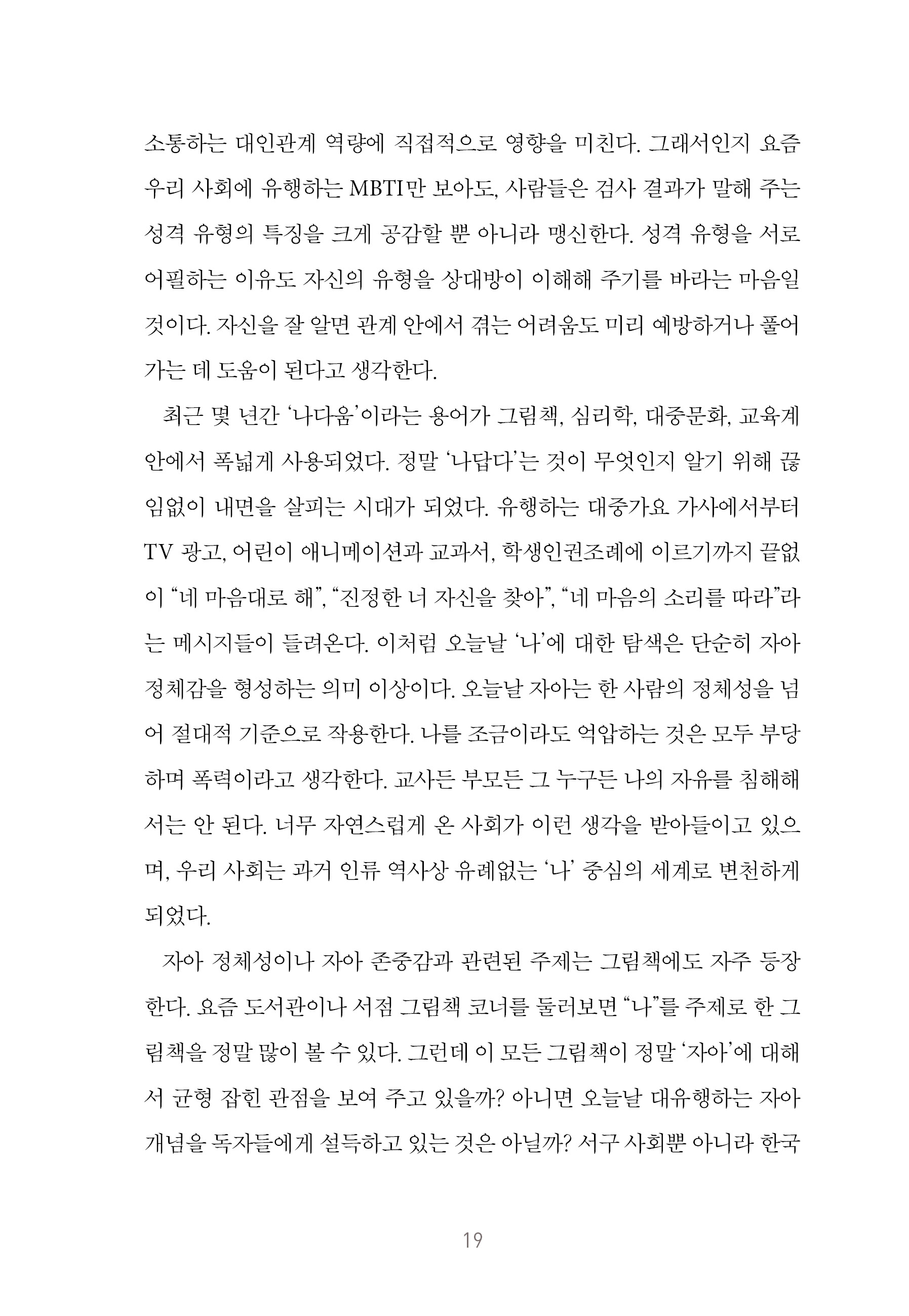부모는 선정도서 목록에 목마르고 베스트셀러 작가와 국제아동도서전의 수상작을 인증하는 반짝이는 스티커에 신뢰를 보냅니다. 아이의 내면세계가 만들어지는 시기에 이 정도가 선택의 기준이 되기에는 늘 아쉬움이 많았습니다. 저는 이 책의 제목만으로도 너무 반갑고 해갈을 느꼈습니다.