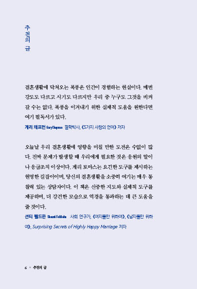 역대 최고로 결혼이 공격받고 있는 이때이기에 역대 최고의 철통같은 방비가 필요하다. 결혼한 지 20년이 넘은 내게 이 책은 귀한 선물이었다.