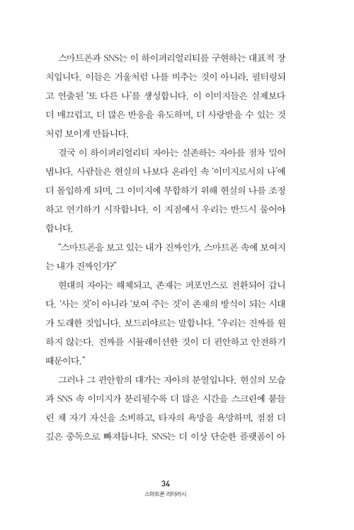 스마트폰과 SNS는 이 하이퍼리얼리티를 구현하는 대표적 장치입니다. 이들은 거울처럼 나를 비추는 것이 아니라, 필터링되고 연출된 ‘또 다른 나’를 생성합니다.