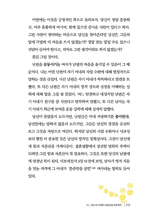 어떤 아내는 남편을 잃을까봐 두려워 자기 의견을 말하지 못하는 덫에 빠진다. 그들은 ‘긁어 부스럼’을 원하지 않는다. 부스럼이 암으로 치닫고 있는 것 같을 때도 말이다. 하지만 이런 수동적인 수용이 남편을 더 빗나가게 하기 쉽다. 남편은 자신의 형편없는 행동을 그냥 참고 사는 아내를 존중하지 않는다. 아내의 이런 태도는 남편의 무례한 행동을 더 강화시킬 뿐이다. 안타깝게도 남편의 분노를 자신의 안전에 대한 최고의 적으로 생각하는 여자들이 많이 있다. 그러나 사실은 나약함과 그에 따른 권태로운 관계가 훨씬 더 강력한 위협이다. (46~47쪽)