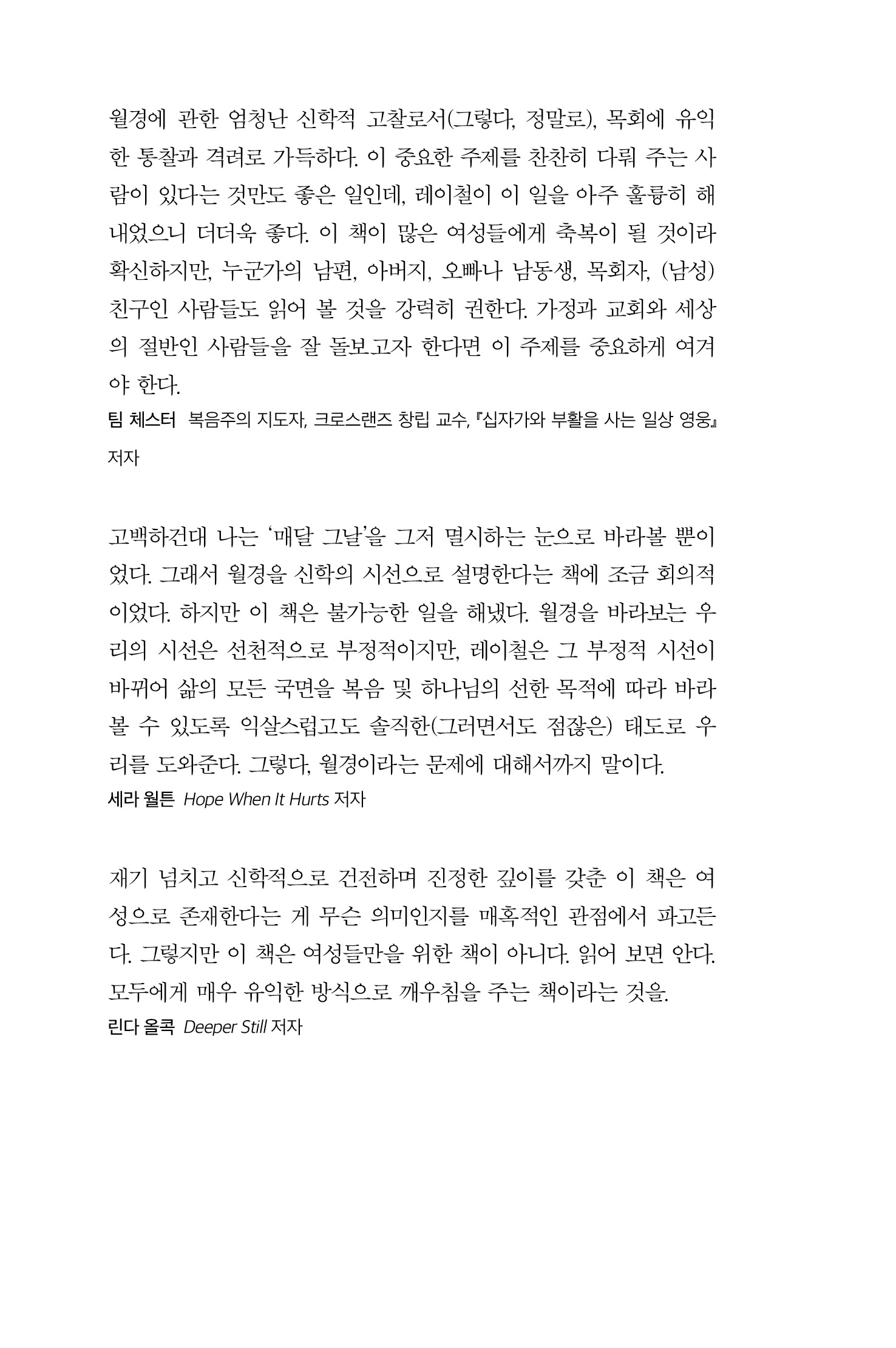 월경에 관한 엄청난 신학적 고찰로서(그렇다, 정말로), 목회에 유익한 통찰과 격려로 가득하다. 이 중요한 주제를 찬찬히 다뤄 주는 사람이 있다는 것만도 좋은 일인데, 레이철이 이 일을 아주 훌륭히 해내었으니 더더욱 좋다. 이 책이 많은 여성들에게 축복이 될 것이라 확신하지만, 누군가의 남편, 아버지, 오빠나 남동생, 목회자, (남성) 친구인 사람들도 읽어 볼 것을 강력히 권한다. 가정과 교회와 세상의 절반인 사람들을 잘 돌보고자 한다면 이 주제를 중요하게 여겨야 한다.