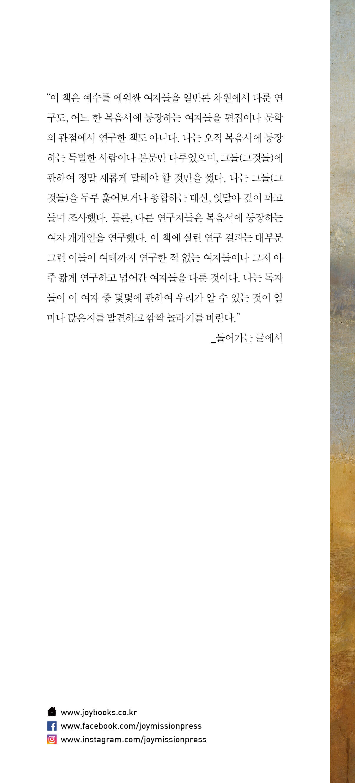 이 책은 예수를 에워싼 여자들을 일반론 차원에서 다룬 연구도, 어느 한 복음서에 등장하는 여자들을 편집이나 문학의 관점에서 연구한 책도 아니다. 나는 오직 복음서에 등장하는 특별한 사람이나 본문만 다루었으며, 그들(그것들)에 관하여 정말 새롭게 말해야 할 것만을 썼다. 나는 그들(그것들)을 두루 훑어 보거나 종합하는 대신, 잇달아 깊이 파고들며 조사했다. 물론, 다른 연구자들은 복음서에 등장하는 여자 개개인을 연구했다. 이 책에 실린 연구 결과는 대부분 그런 이들이 여태까지 연구한 적 없는 여자들이나 그저 아주 짧게 연구하고 넘어간 여자들을 다룬 것이다. 나는 독자들이 이 여자 중 몇몇에 관하여 우리가 알 수 있는 것이 얼마나 많은지를 발견하고 깜짝 놀라기를 바란다.