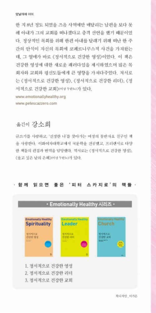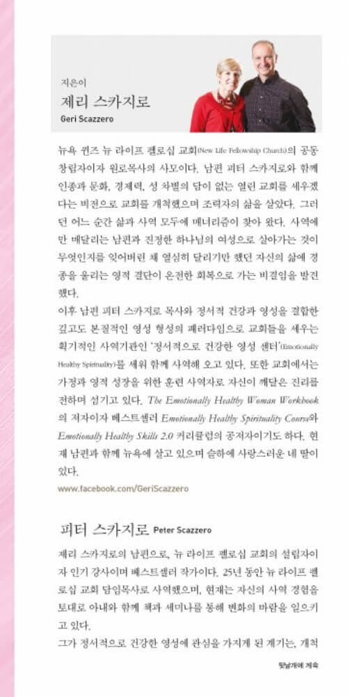 “제리 스카지로는 자신의 삶이 단단히 잘못되었다는 것을 깨달았다. 자신이 꼭 남편도 없이 어린 네 딸을 홀로 키우는 과부처럼 느껴졌다. 참다못한 그녀는 마침내 남편에게 “그만두겠어요”라고 선언하고서 남편의 목회로 나날이 성장하던 교회를 떠나버렸다. 그때부터 그녀 자신과 가정이 온전한 회복으로 가는 여행이 시작되었다.