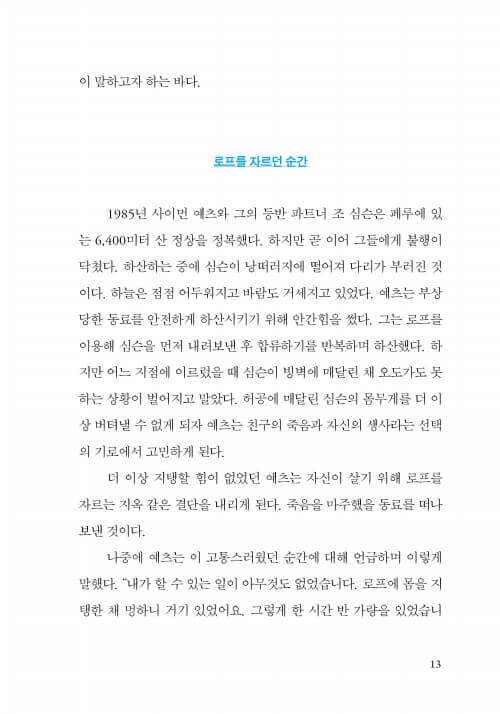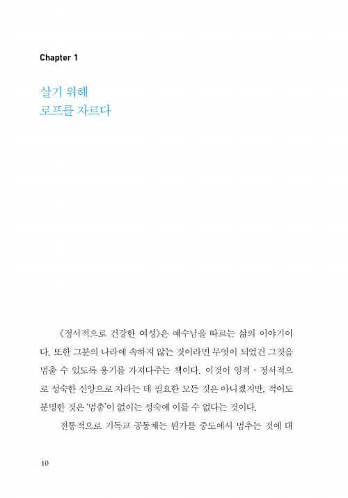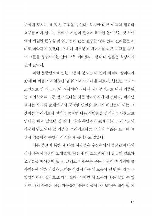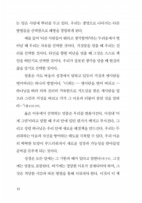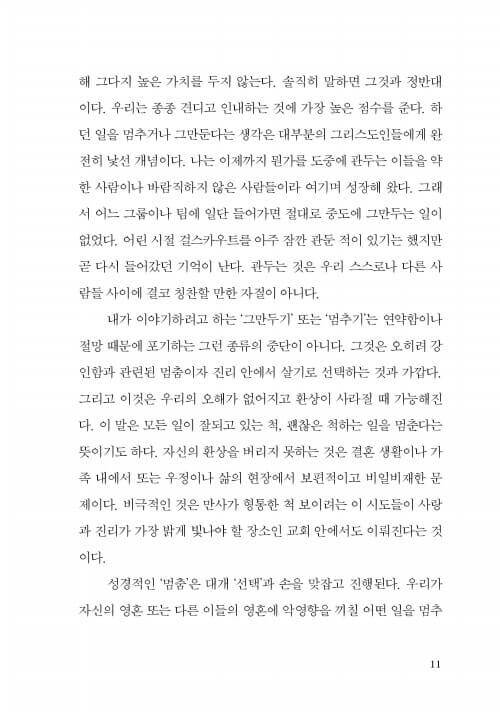 정서적인 건강으로 가는 길은 ‘그만두는 것’으로 시작된다. 제리는 남들의 이목에 신경쓰는 것을 그만두었다. 자신의 분노와 슬픔을 부인하던 것도 그만두었다. 자신의 본모습이 아닌 다른 누군가로 살아가던 것도 그만두었다. 그때 비로소 생명으로 이어지는 새로운 삶과 인간관계가 가능하다는 것을 발견하였다. 이러한 멈춤이 자신의 고유함을 따르는 삶, 하나님이 우리에게 주신 길을 가게하는 것이다. 이 책에서 말하는 여덟가지 성경적 멈춤은 한 번에 끝나는 일이 아니라 계속해서 이어져야 할 영적 훈련임을 기억하라.”