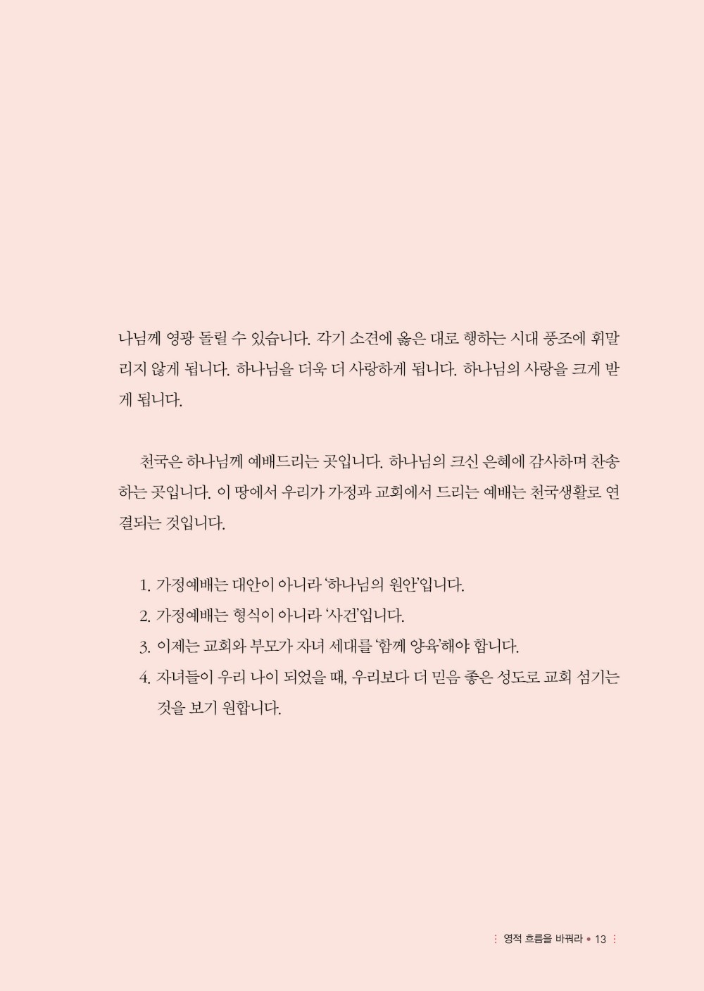 이 책은 신앙의 부모들이 자녀들과 함께 집에서 예배를 드릴 수 있도록 매우 구체적인 가이드를 제시하고 있습니다. 온 가족이 함께 말씀을 읽고 나누고, 기도하고 축복하기까지 진행되는 이 책을 통해 침체된 한국 교회의 영적인 흐름이 바뀌고, 다시 회복될 수 있으리라는 소망을 가지고 이 책을 적극적으로 추천합니다.