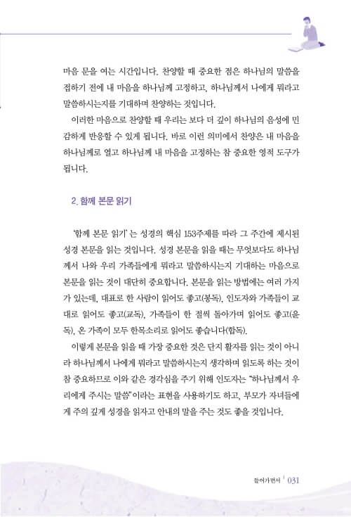 둘째, 이 책의 가정예배문은 쉽고 이해하기 쉬울 뿐만 아니라 아주 흥미 있는 풀텍스트로 구성되어 있어서 자녀들도 주체가 되어 가정예배를 인도할 수 있다. 이것은 우리 자녀들의 인성과 사회성 발달에 큰 훈련이 된다.