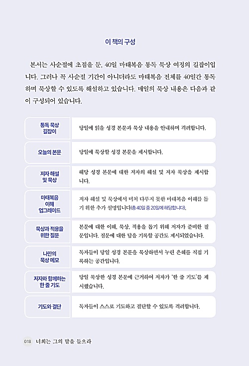 사순절 기간 마태복음 묵상을 통하여 예수님의 행적 속 십자가와 부활의 비밀을 깨달아 구원의 감격을 회복하고 풍성한 은혜를 누리기를 원하는 모든 성도에게 추천한다.