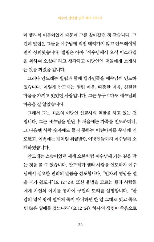 그의 이야기는 오늘을 사는 우리 또한 제자로서의 삶을 살아야 한다는 베시지를 담고 잇다. 열두 제자 이야기는 지나간 역사가