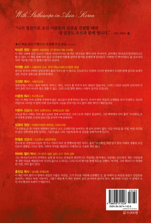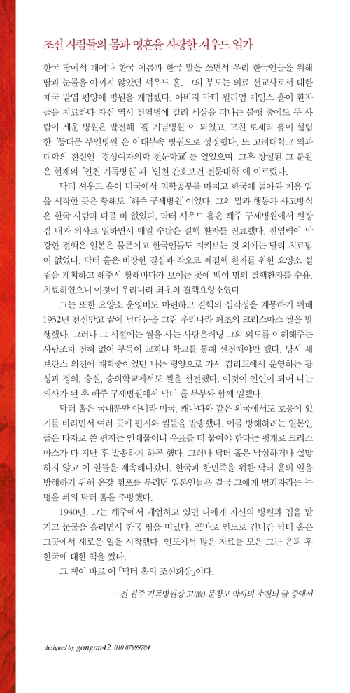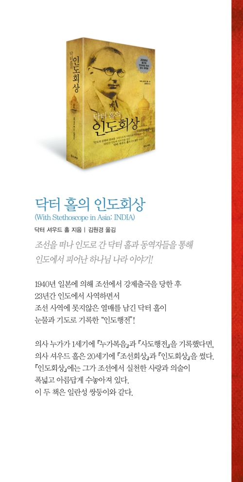 하나님으로부터 부여받은 굽힐 줄 모르는 인내심과 결단력으로 처음에는 한국에서, 나중에는 인도에서, 병든 사람들에게 귀한 의술을 베풀었으며 자신의 삶으로 드러나는 그리스도의 향기를 통해 복음을 전했다. 여기에, 그의 책보다 더 위대한 한 사람, 닥터 홀이 있다.