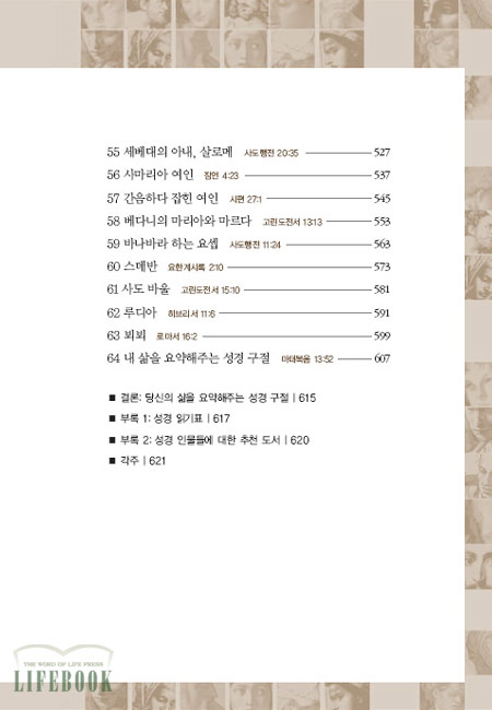 이르기까지 성경인물 63명을 새롭게 탐색한 대단한 개관서이다. 저자는 각각의 인물들을 규정하는 하나의 성경 구절을 제시하고,