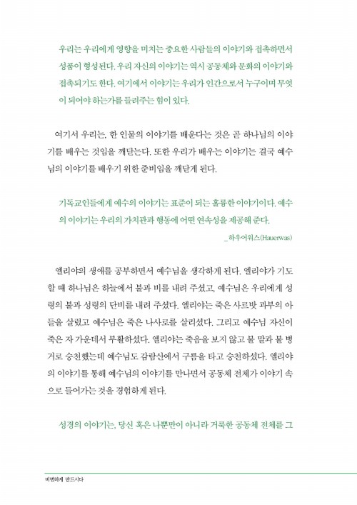 우리도 엘리야처럼 예수님을 생각나게 하는 삶을 살았으면 좋겠다는 저자의 마음을 마지막으로 전하고 싶다.