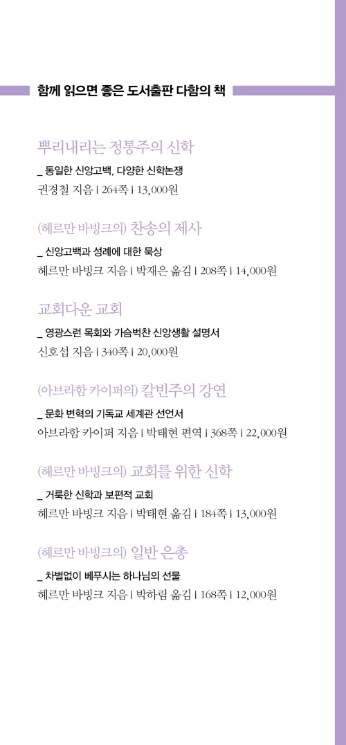 역사 속에 큰 족적을 남긴 한 사람이 살아간 발자취를 따라가 보는 일은 언제나 가슴 설레고 흥미진진한 일이다. 특히 프랑수아 투레티니와 같이 탁월한 신학자의 삶은 우리에게 많은 감동과 교훈을 준다.