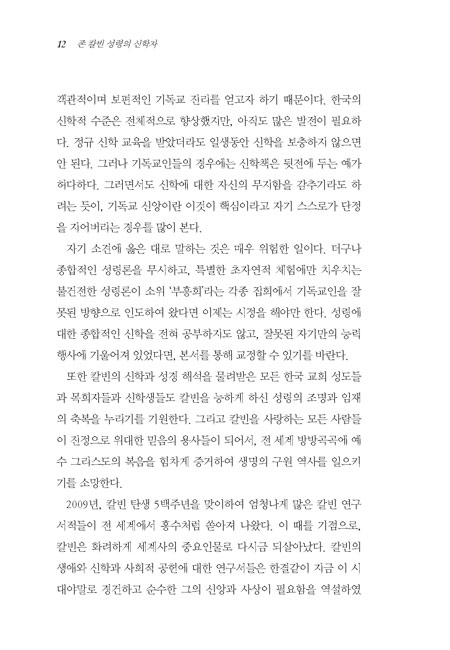 본서는 그리스도와 신자를 연합시키며, 성령을 내적 조명으로 깨닫게 하시고, 율법이 요구하는 것을 성취하게 하시며, 승귀하신 그리스도의 몸을 이 땅에 임재하게 하시는 성령의 역할을 알기 쉽게 설명하고 있다. 이는 지금까지 주목받지 못했던 존 칼빈의 성령론으로, 성령론에 대해 큰 혼란을 겪고 있는 한국교회에 새로운 빛을 제시할 것이다.