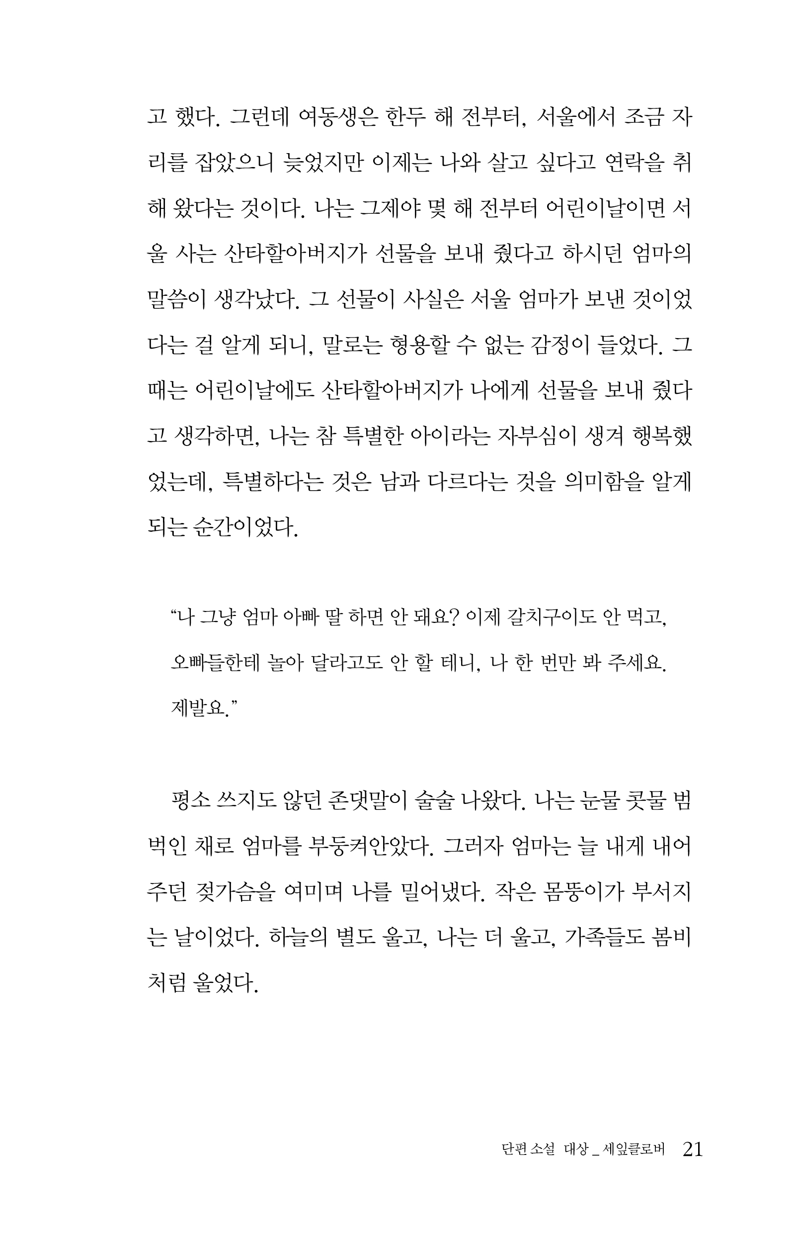 가작 세 편 중 〈들보 속 가시밭길〉은 가정과 직장 생활에서의 갈등을 현실감 있게 드러내면서 화해의 과정을 설득력 있게 전개했다. 구성에 좀 더 신경을 썼으면 하는 아쉬움이 있었다.