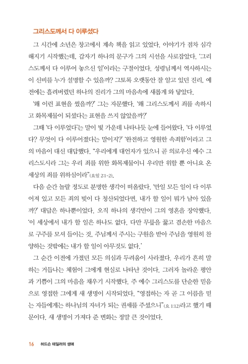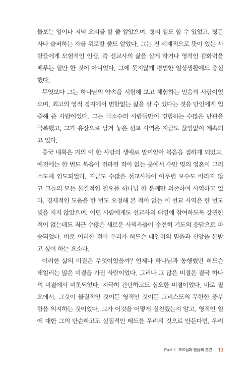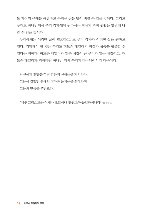 그는 무엇보다도 하나님의 약속을 시험해 보고 체험하는 믿음의 사람이었으며, 최고의 영적 경지에서 변함없는 삶을 살 수 있다는 것을 만인에게 입증해 준 사람이었다. 그는 극소수의 사람들만이 경험하는 수많은 난관을 극복했고, 그가 유산으로 남겨 놓은 선교 사역은 지금도 끊임없이 계속되고 있다. 위대한 사람은 세월이 흐를수록 더 큰 영향력을 발휘한다!