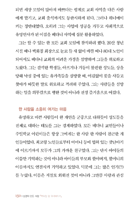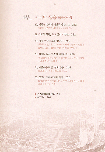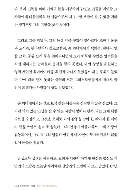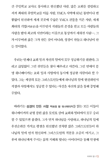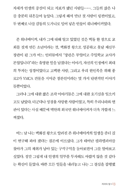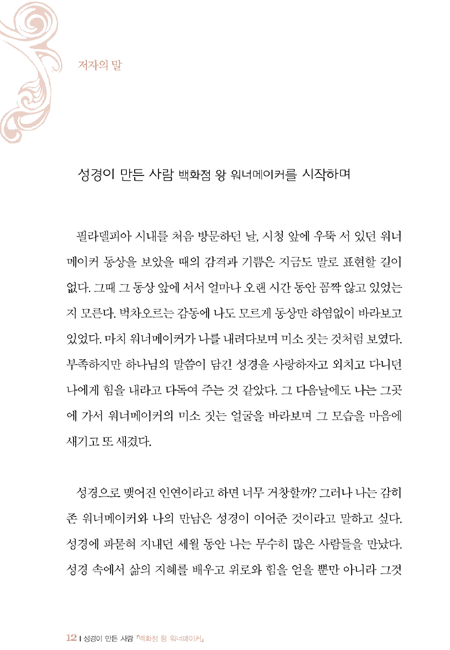 「성경이 만든 사람 백화점 왕 워너이커」에는 금 같은 믿음을 소중히 여기고 굳게 지킨 한 사람의 일생이 담겨 있습니다. 하나님이 주신 믿음을 더 가치 있게 만든 자가 어떻게 축복을 받았는지, 그리고 그가 후대에 어떤 영향을 주었는지 생생하게 기록하고 있습니다. ···이 귀한 책을 통해 믿음으로 이 세상을 이기는 귀한 "믿음의 경주자들" 이 더 많아지기를 바랍니다.
