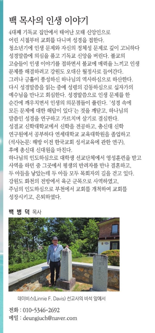 뒤돌아보면 지나간 모든 시간들이 매우 그립다. 이 책에 기록하지 못한 수많은 이야기들이 있다. 참으로 보람스러운 일들과 즐거운 일들도 많았다. 또한 생각하기 싫은 일들과 마음이 아픈 일들도 많았다. 내가 걸어온 길은 실수와 후회 그리고 눈물로 얼룩진 페이지도 많았다. 그럼에도 불구하고 여기까지 나의 인생 여정을 인도해 주신 우리 주 하나님께 감사와 영광을 올려 드린다. 목회를 은퇴하고도 나는 하나님 말씀 전하는 사명을 감당하고 싶었다. 그래서인지 거의 쉬지 않고 하나님 말씀을 전할 수 있는 사명을 이루어내고 있다. 마음에 감동이고 감사뿐이다.