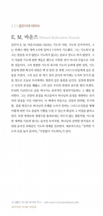 E. M. 바운즈(Edward McKendree Bounds)는 1835년 8월 15일 미국 미주리 주 쉘비에서 아버지 토머스 바운즈(Thomas J. Bounds)와 어머니 해티 바운즈(Hatty Bounds) 사이에서 태어났다. 바운즈는 미주리 주의 최연소 변호사로 이름을 떨치다가 1854 ~ 1858년의 대 영성 운동을 통해 하나님의 부르심에 순종하여 목사가 되기로 서약했다. 그는 변호사 사무실을 개업한 지 5년 만에 폐업하고 센테너리 감리교신학교를 졸업한 후 1859년에 목사 안수를 받았다. 남북전쟁 당시 최전방에 서서 혼신을 다해 부상병들을 보살피다가 포로생활을 하기도 했다. 석방된 후에는 프랭클린 감리교회와 세인트루이스 교회를 섬겼다. 바운즈는 한평생 설교자들의 성화. 북미 교회의 부흥. 그리스도인들의 거룩함을 위해 끊임없이 기도했고. 1913년 8월 24일 조지아 주 워싱턴에서 78세를 일기로 세상을 떠났다. 대표작으로는 『기도는 강하다』(두란노). 『기도의 위인들』.『기도의 본질』.『기도의 가능성』(이상 생명의말씀사).『기도의 능력』(크리스챤다이제스트) 등이 있다.
