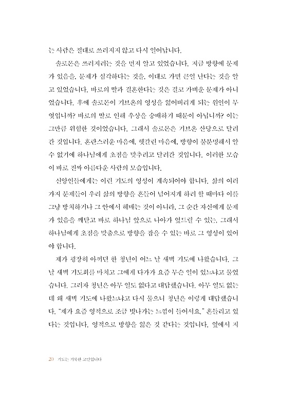 성도의 삶에 기도란, 하나님이 인생의 주인되심을 고백하는 영적 표현이다. 기도할 때 우리는 자신의 뜻을 주장하는 것이 아니라, 하나님의 마음을 살필 수 있다. 또한 피조물로서의 연약한 나를 발견하고, 창조주되시는 하나님의 권능을 전적으로 의지하며 나아갈 수 있다. 그만큼 기도란 기독교에 있어 신앙의 중심이 되는 축이라고 할 수 있다. 이 책은 전작인 ≪기도의 사람≫에 이어 한 시대를 하나님의 사람으로 쓰임 받은 선지자들의 삶과 신앙을 통해 그들이 어떻게 기도하고, 어떻게 인생의 문제들을 풀어나갔는지 이야기하고 있다. 기도가 익숙지 않은 이들, 기도의 방법을 잘 모르는 이들, 기도의 중요성을 다시 일깨우고자 하는 이들에게 기도에 대한 거룩한 도전으로 다가갈 것이다. 이 책을 통해 이 시대를 향한 살아있는 기도, 하나님의 뜻이 이뤄지는 기도, 위로와 평안이 있는 소망의 기도를 드려보면 어떨까?